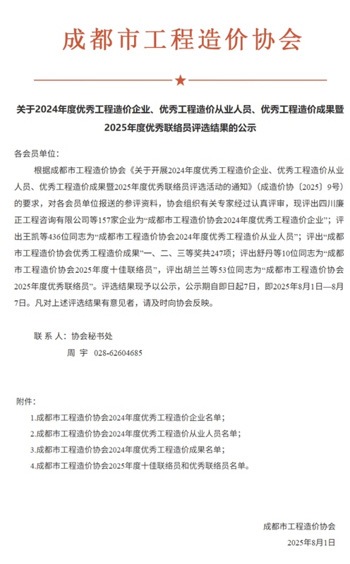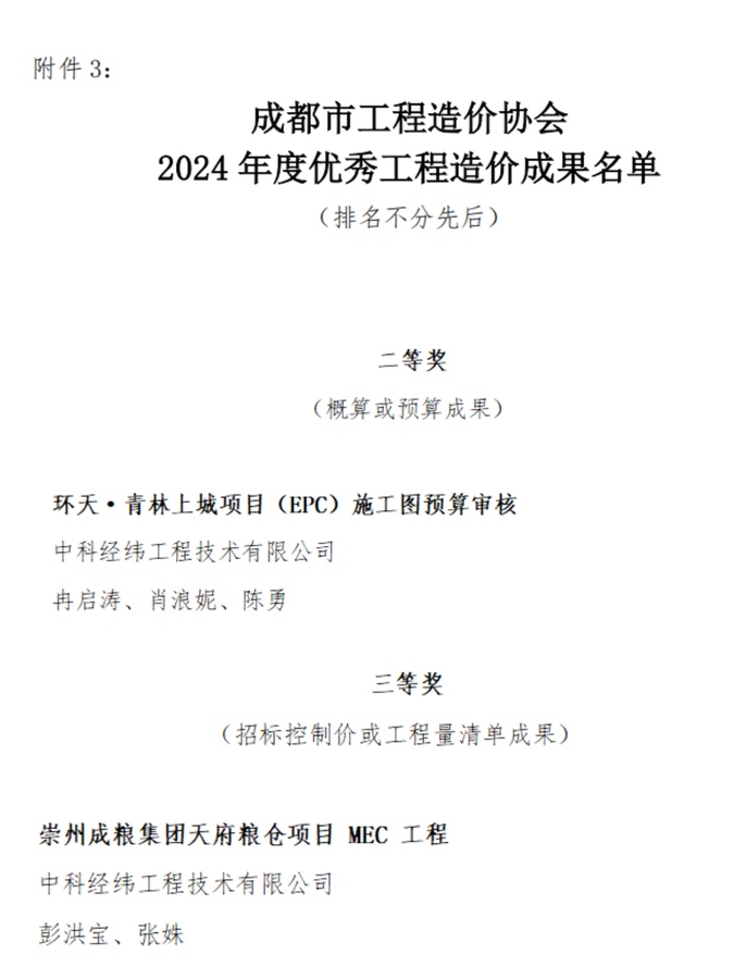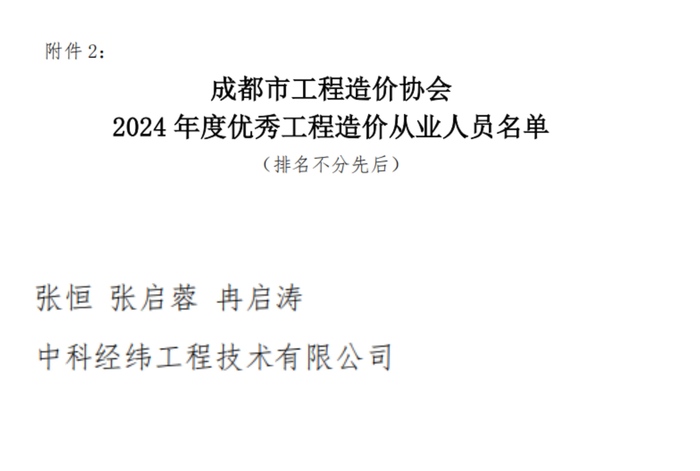 近日,成都市工程造价协会发布2024年度优秀评选结果公示,中科经纬一举荣获“成都市工程造价协会2024年度优秀工程造价企业”“成都市工程造价协会2024年度优秀工程造价从业人员”“成都市工程造价协会2024年度优秀工程造价成果”三项荣誉。